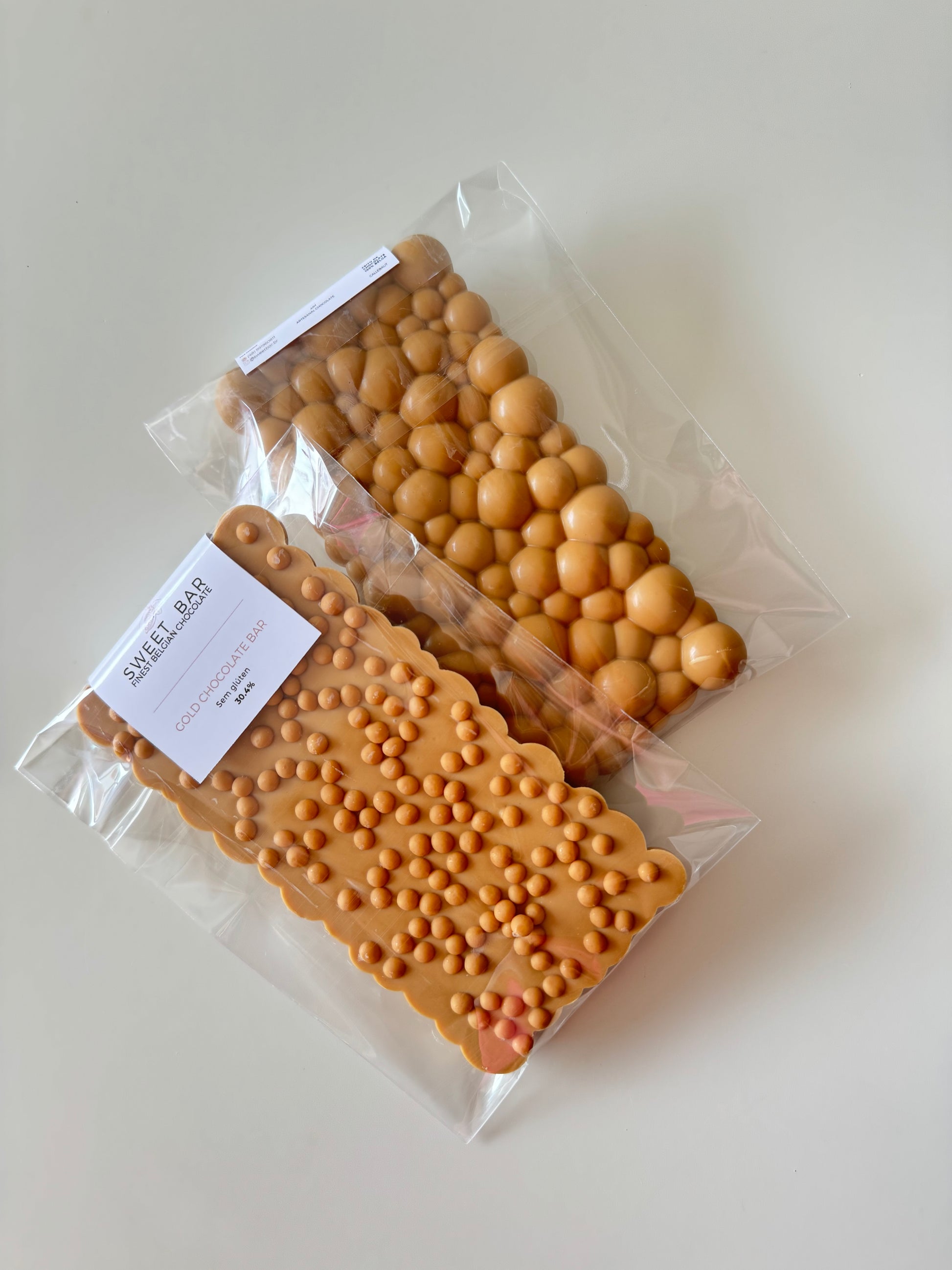 Barra de chocolate gold caramelo 30.4% de cacau com crispearls sabor caramelo.